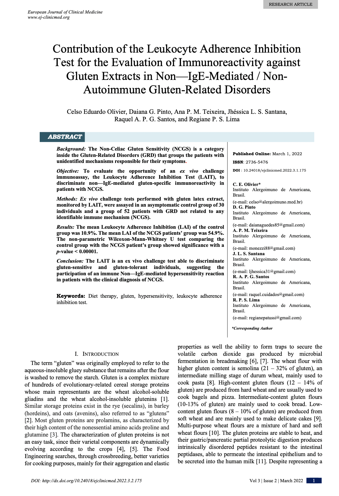 Conclusion: The LAIT is an ex vivo challenge test able to discriminate gluten-sensitive and gluten-tolerant individuals, suggesting the participation of an immune Non—IgE-mediated hypersensitivity reaction in patients with the clinical diagnosis of NCGS.