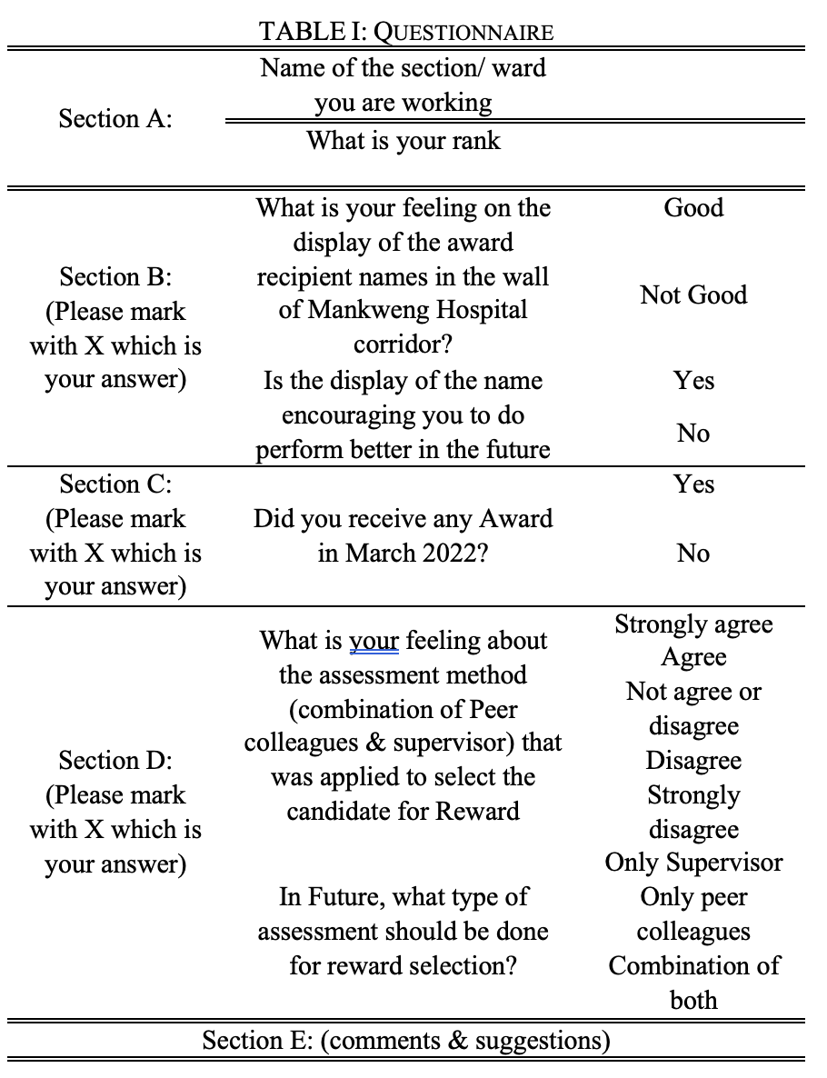 Background: The concept of giving out accolades and rewards has been there for centuries. When an individual is recognized for their good deed, they feel delighted. This inspires them to keep getting better and binds them to greater goals. First Annual award ceremony of the Mankweng Tertiary and Academic Hospital was held in March 2022. The hospital’s management recognized outstanding employees from all the different sections. After the ceremony, the hospital’s management displayed those award winners’ names on the wall of the main corridor of the hospital and this was done in order to enhance further motivation, engagement & encouragement. The main objective of the study to find out the employee’s perception on the displaying reward winner names in the wall of the Mankweng Hospital corridor and whether there is any enhancement of the employees' motivation.