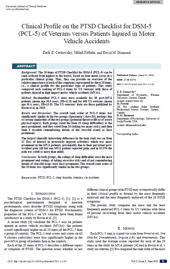 Cernovsky ZZ, Fattahi M, Litman LC, and Diamond DM. Validation of the PTSD Checklist for DSM-5 (PCL-5) on Patients Injured in Car Accidents. European Journal of Medical and Health Sciences. 2021;3(2):154-159.