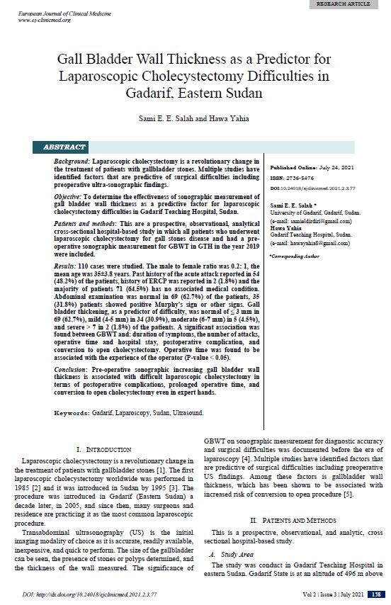 Objective: To determine the effectiveness of sonographic measurement of gall bladder wall thickness as a predictive factor for laparoscopic cholecystectomy difficulties in Gadarif Teaching Hospital, Sudan.