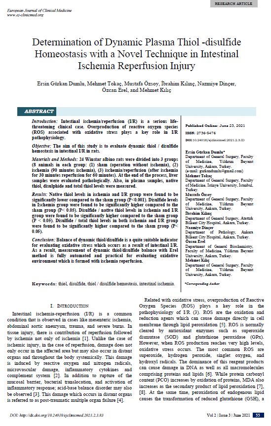 Conclusion: Balance of dynamic thiol/disulfide is a quite suitable indicator for evaluating oxidative stress which occurs as a result of intestinal I/R. As a result, measurement of dynamic thiol/disulfide balance with Erel method is fully automated and practical for evaluating oxidative environment which is formed with ischemia reperfusion.