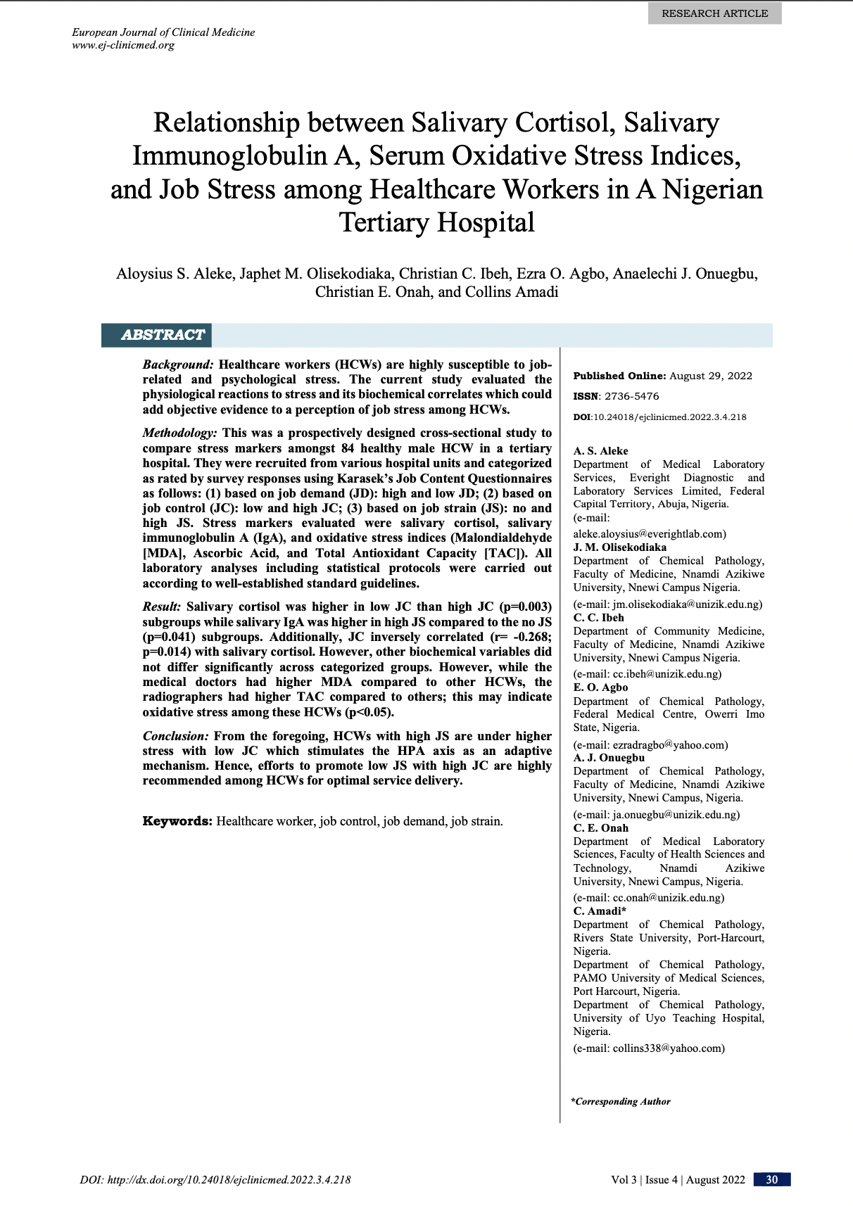 Aloysius S. Aleke, Japhet M. Olisekodiaka, Christian C. Ibeh, Ezra O. Agbo, Anaelechi J. Onuegbu, Christian E. Onah, Collins Amadi