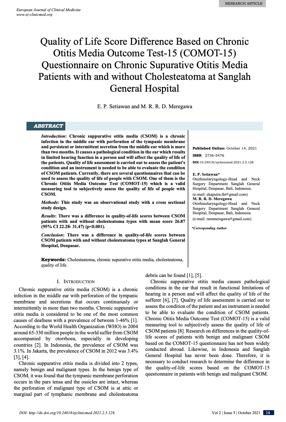 Quality of Life Score Difference Based on Chronic Otitis Media Outcome Test-15 (COMOT-15) Questionnaire on Chronic Supurative Otitis Media Patients with and without Cholesteatoma at Sanglah General Hospital