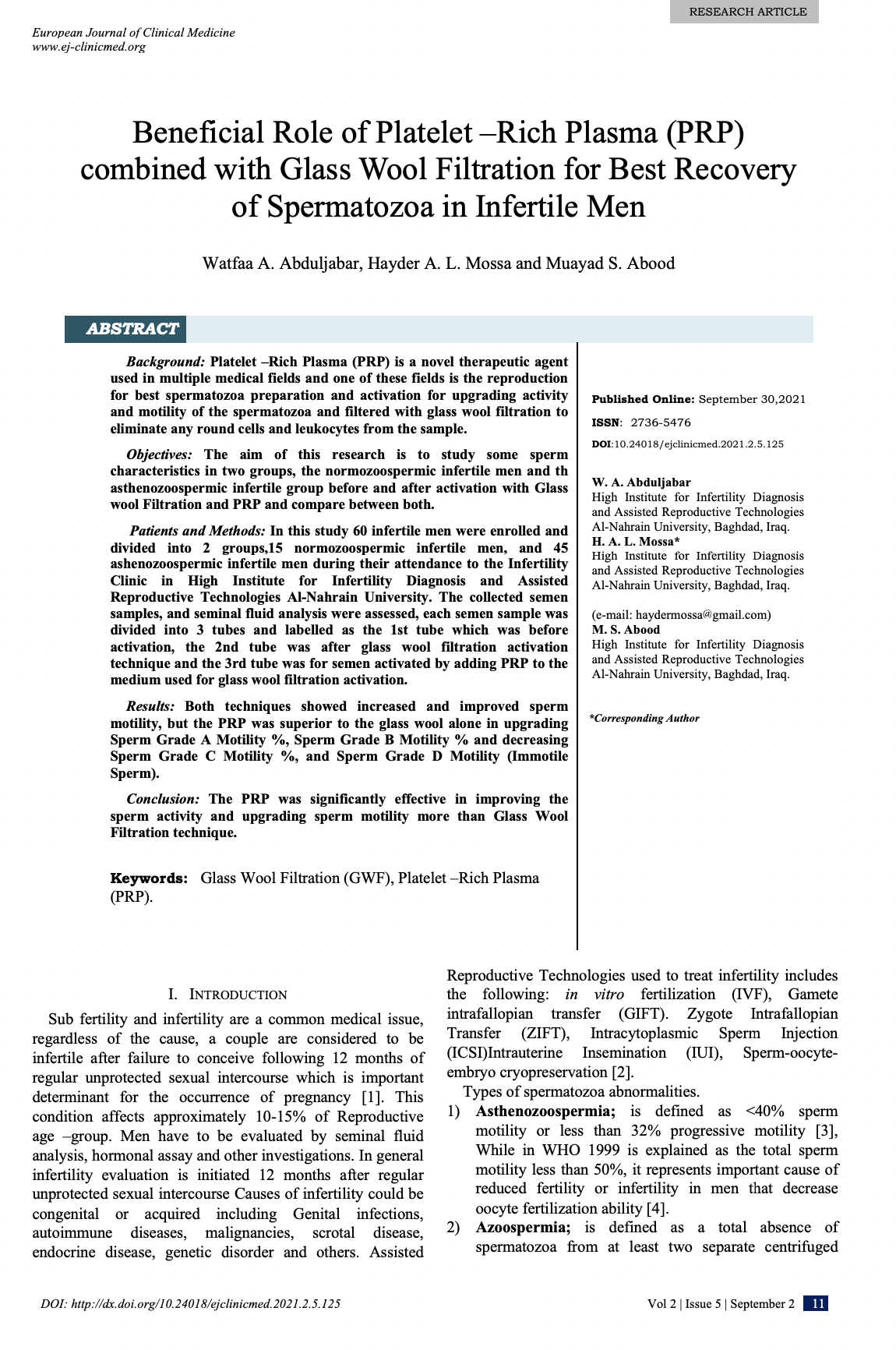 Beneficial Role of Platelet –Rich Plasma (PRP) combined with Glass Wool Filtration for Best Recovery of Spermatozoa in Infertile Men
