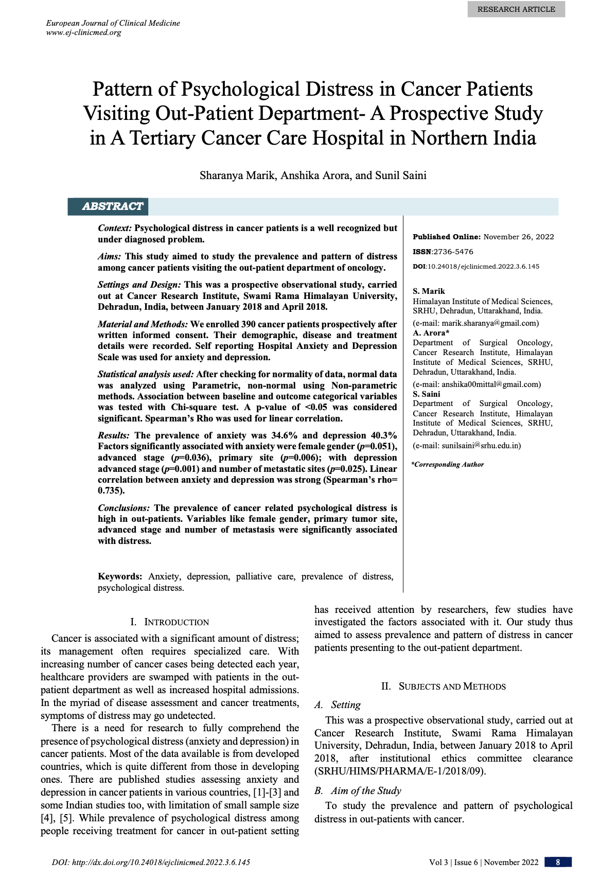 Pattern of Psychological Distress in Cancer Patients Visiting Out-Patient Department- A Prospective Study in A Tertiary Cancer Care Hospital in Northern India